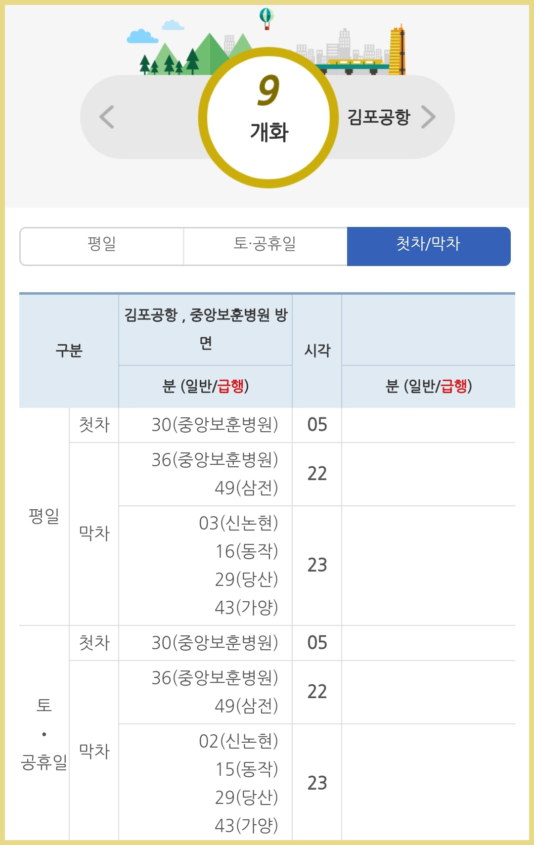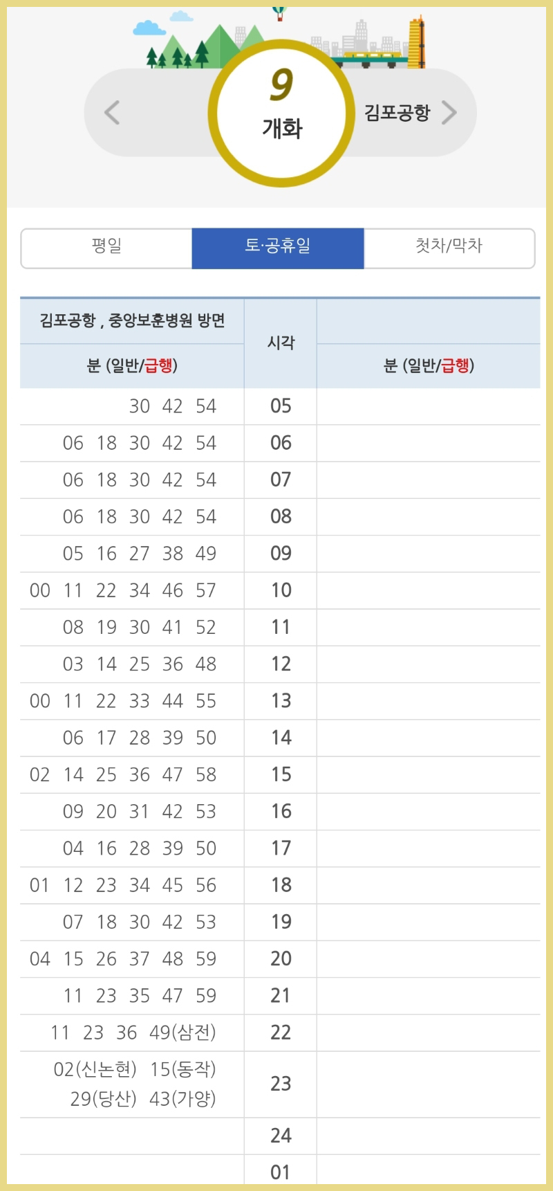 좀 더 정확한것을 알고 싶은분은 9호선 급행정차역 시간표 / 한국Subway Line No.9 click를 눌러주시면 됩니다.