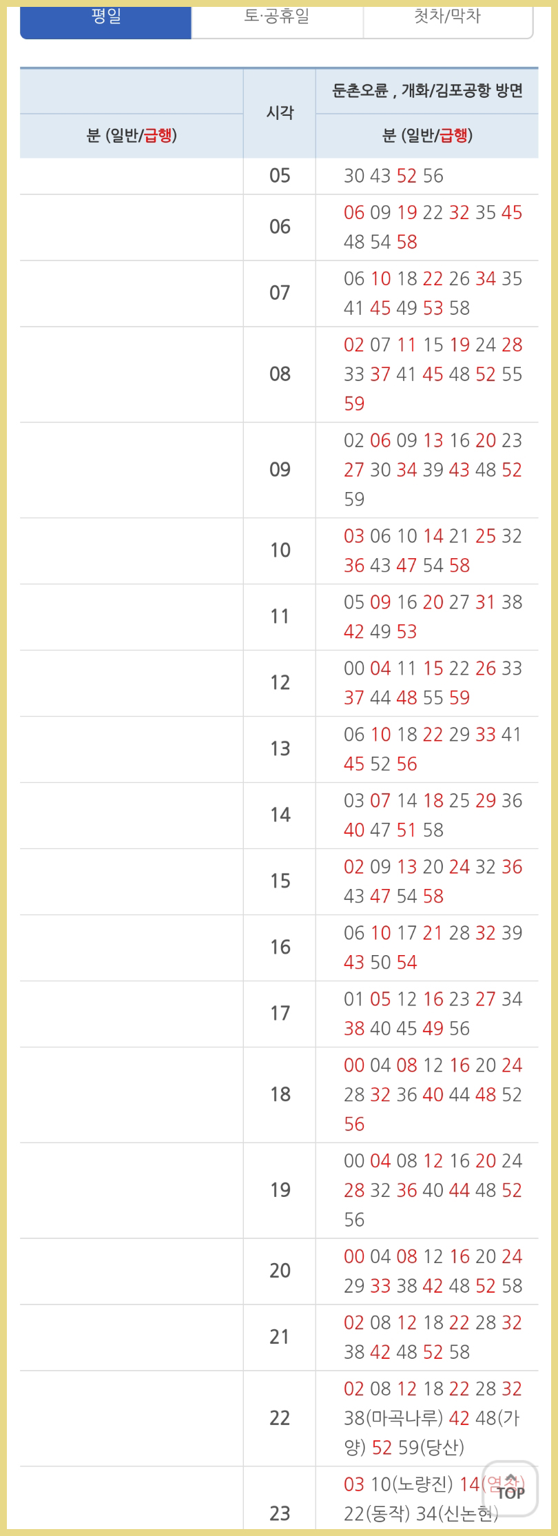 토요일, 공휴일 시간표이고, 급행의 경우 빨간색으로 표시가 되어있으니 참고해주세요.