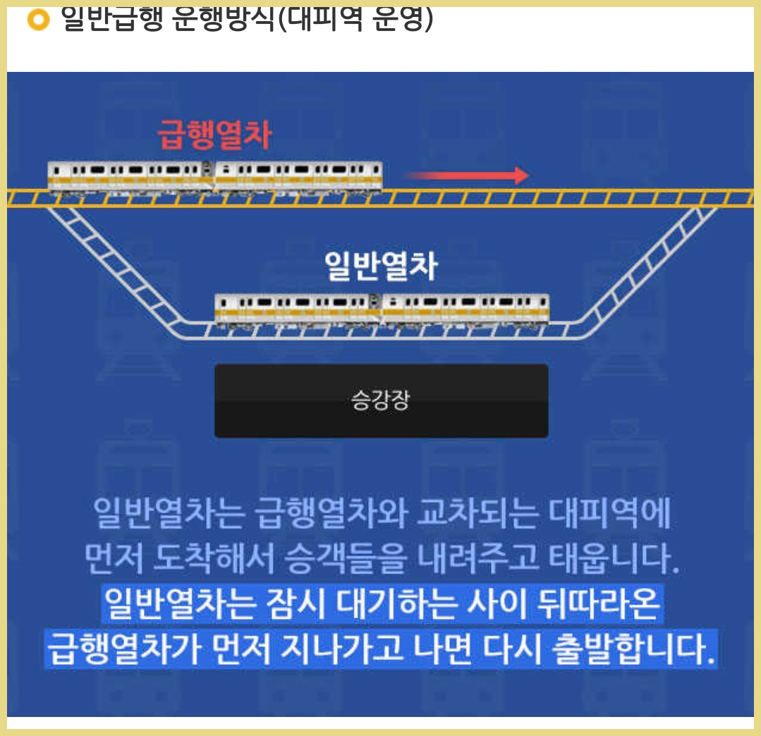 일반 열차는 급행열차와 교차가 되는 대피역에 먼저 도착을 해서 승객들을 내려주고, 태우는데, 일반열차는 잠시 대기를 하는 사이에 뒤따라온 급행열차가 먼저 지나가고 나면 다시 출발을 합니다.