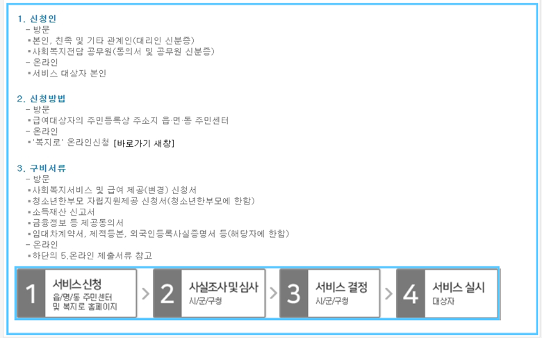 신청방법: 읍, 면 동사무소 신청을 하거나 복지로 온라인에서 신청이 가능.