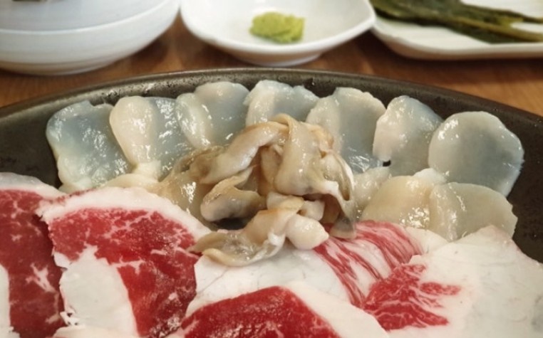 국물을 몇 번 떠먹고 나서 또다시 먹방에 돌입합니다. 차돌과 키조개만도 먹어보기도 하고, 명이나물을 깔고 고추냉이를 올리고 먹어보기도 했어요. 고깃집에서 명이나물이 나오면 나온 것은 다 먹을 정도로 고기와 함께 먹는 것을 좋아하는데, 역시나 명이나물은 오늘도 맛있네요