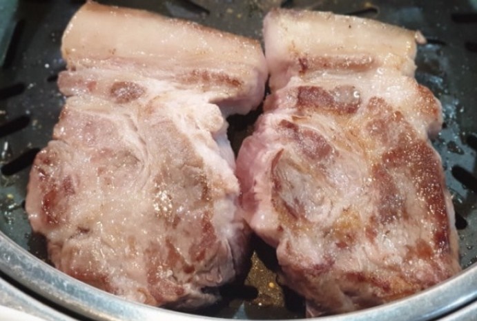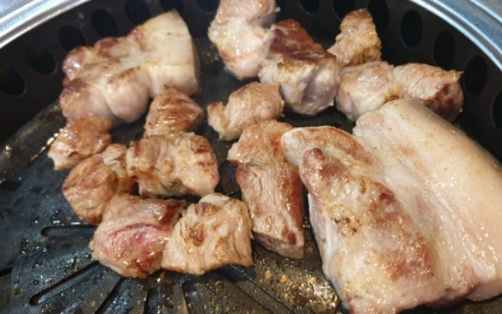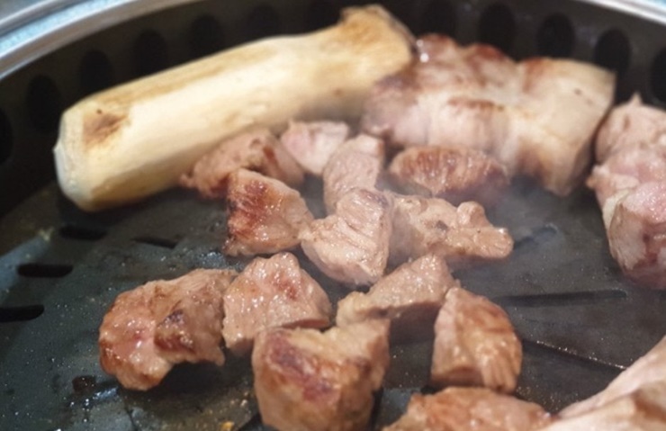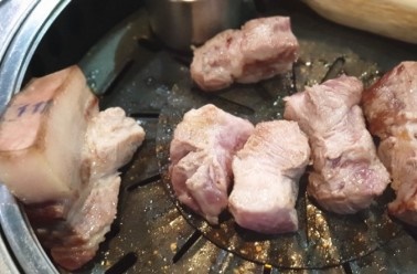 돈사촌노형점은 참나무를 이용해 고기를 구워요 전에 옥수수로 고기 굽는 것을 경험해 보았는데, 참나무는 어쩔지 모르겠네요 참나무 향이 솔솔 베여있어서 고기가 더 맛있을까요? 겉면이 노릇노릇 익고 있어요. 안에까지 잘 익을까요? 하상 고기가 두꺼우면 안에까지 잘 익을지 걱정이 되어요^0^