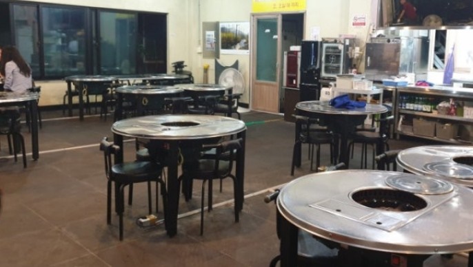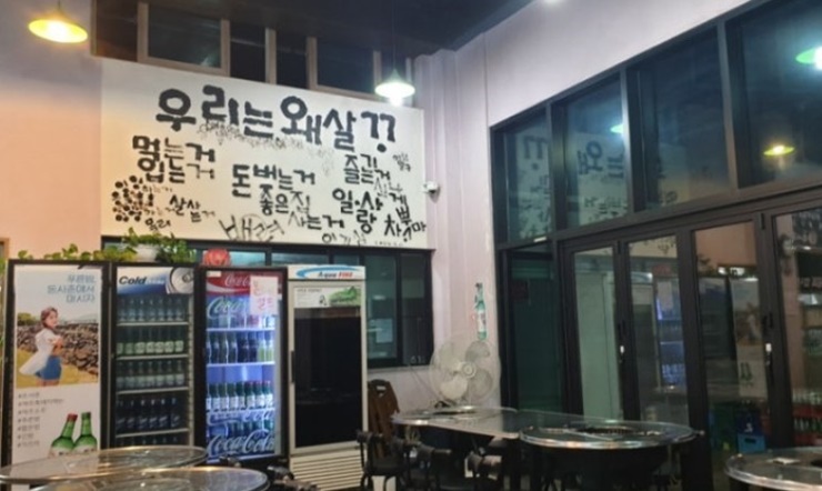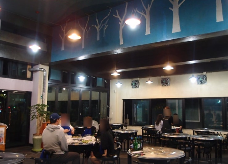 주차하고 나니 길 건너에 돈사촌이 보이는군요!! 전체가 다 창으로 되어 있네요. 가을 날씨에 문을 다 열고 고기를 구워 먹으면 되겠어요. 그러면 야외에서 고기를 굽는 느낌이 나서 더 좋지요