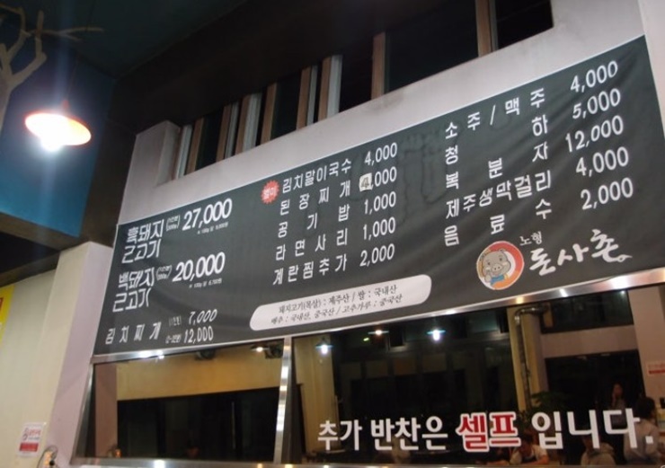 한눈에 확 들어오는 큰 메뉴판이에요. 아이들이 있을 대는 이 메뉴판을 쳐다보는 것도 번거로울 때가 많아요 서로 메뉴판을 보겠다고 싸우는 경우도 있거든요. 이렇게 벽면에 크게 붙어있으니 같이 보고 고를 수 있어서 좋네요. 저흰 흑돼지 근고기와 백돼지 근고기 그리고, 김치찌개, 김치말이 국수를 주문했어요.