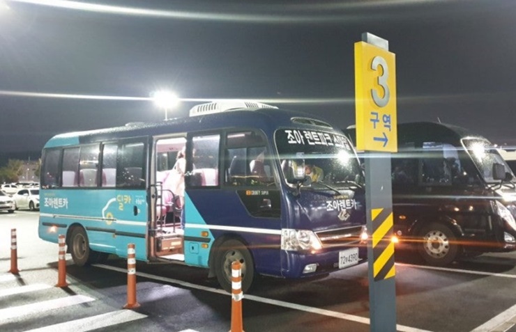 8시 35분쯤 제주 공항에 도착했어요. 공항에 도착해서 수화물을 찾고 렌터카를 찾으러 가야 하는데 그러면 렌터카하우스로 가야 해요. 렌터카하우스는 모든 렌터카셔틀차량이 있는 곳인데요. 각 회사마다 번호가 있으니 가기 전에 렌터카에서 준 문자나 톡 확인하시면 돼요. 8시 이후 가 되면 렌터카셔틀을 20분 간격에서 30분 간격으로 변경이 돼서 결국 9시쯤 렌터카 셔틀을 타게 되었죠!