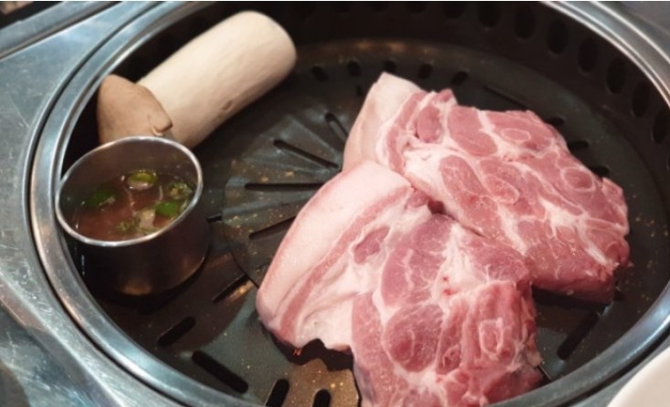 흑돼지와 백돼지 등장!! 고기 색상만 보아도 신선해 보이죠? 지방이 골고루 있는 게 아주 신선해 보이고, 고기 두툼한 거 봐요!!고기 불판에 버섯과 멜젓과 함께 올려주세요~~흑돼지와 백돼지 구분을 하시나요? 제가 백돼지가 흰색이에요?라고 하니 그렇지 않다고 하시면서 흑돼지라고 해도 딸을 다 뽑기 때문에 흑돼지와 백돼지를 구분하기는 어렵다고 하시더라고요.