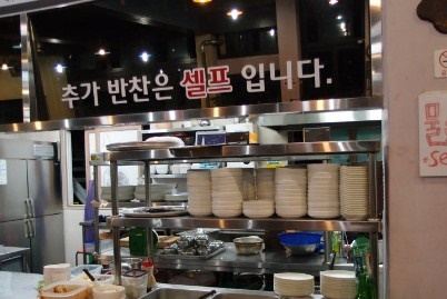 셀프 코너예요. 셀프바가 있으면 좋지요! 저는 직원분께 가져다 달라고 수시로 이야기하는 것보다는 내가 먹고 싶은 것을 수시로 가지고 가서 먹을 수 있는 것이 좋거든요. 셀프코너에 멜젓도 있네요^0^