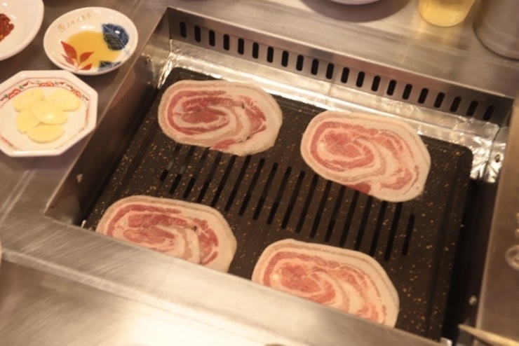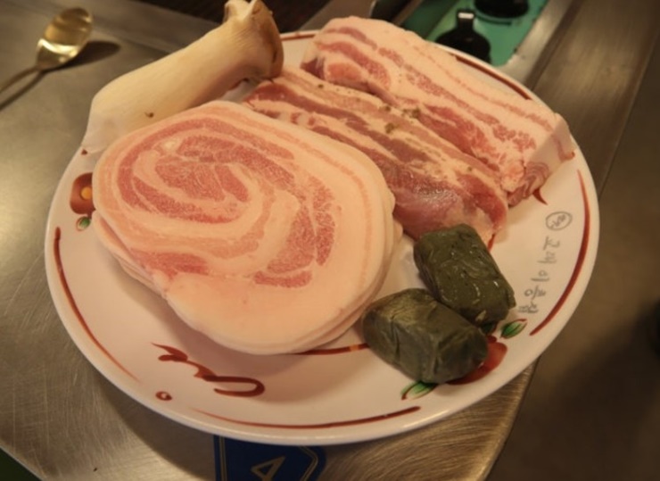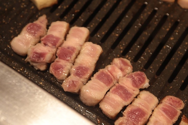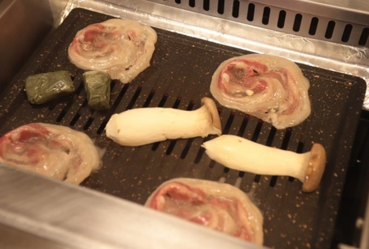 고기를 불판에 올려놓았어요. 고기는 양옆에 놓아야 한데요! 고기는 양옆에 버섯과 떡은 가운데에 놓았어요. 꽃삼겹은 얇아 불판에 올리지 마자 익네요. 얇은 선홍색 꽃삼겹은 윤기를 내며 투명하게 익어 갑니다. 사장님께서 그러시는데, 고기가 안 좋으면 고기를 구웠을 때 흰색진액이 나온데요. 꽃삼겹은 감자피로 만든 만두를 갓쪄낸듯한 투명하고 촉촉한 비주얼이 연상도기도 합니다.