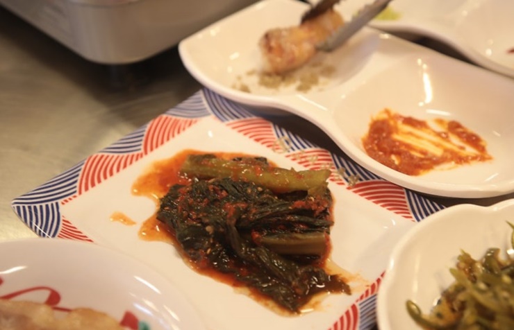 고기와 함께 먹을 수 있는 쌈장, 곰소포구의 순태젓 갈, 생고추냉이 그리고, 마늘과 조청도 나왔어요. 싸 먹을 수 있는 명이나물과 김치도요, 삼겹살과 궁합이 좋은 정갈한 기본찬이 다양하게 제공되고 있어요. 명이나물은 추가로 주문할 경우 1000원이어요~~