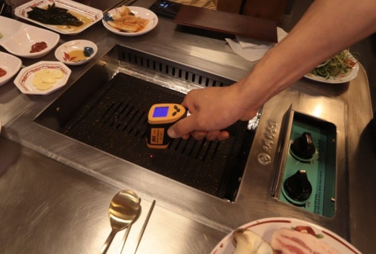 꽃삼겹과 통삼겹이 나왔어요. 고기빛깔 보세요. 꽃삼겹은 냉동인데, 어쩜 저리 색깔이 이쁜가요?? 아저씨가 오셔서 고기를 구워주세요 불온도를 체크해 주시네요. 최적의 온도(230도 이하)를 맞추기 위해 온도측정기까지 동원!!! 고기는 몇 도에 굽는지 물어보았더니 꽃삼겹은 230도 이하고, 통삼겹은 230도에서 굽는다고 해요