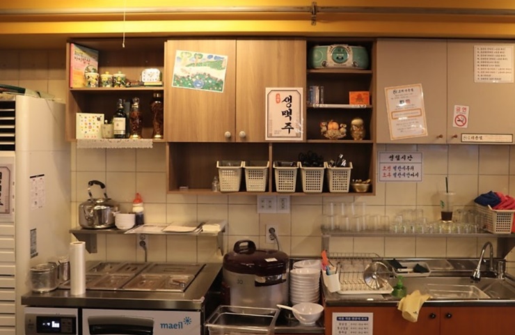교대 이층 집은 여럿이 방문해도 테이블별로 떨어질 필요 없이 여럿이 둘러앉아 대화하기 좋은 테이블 구조로 되어 있어요. 왜 다들 회식을 하는지 알겠어요!! 더구나 매장 홀 내에 작은 주방(미니주방)이 있어요. 그래서 밑반찬이 떨어지면 빠르게 채워주는 서비스를 제공할 수 있고, 회식이나 모임을 왔을 때 이렇게 미니주방이 있으니 가정집에 와서 먹는 느낌도 날 것 같아요