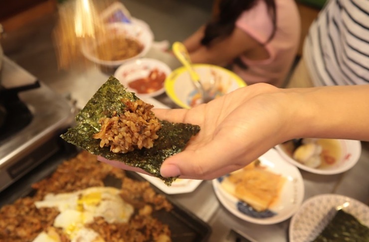 계란이 반숙이 되어 나오면 계란과 볶음밥을 비벼서 먹으면 돼요. 계란과 볶음밥을 비비고 생김과 함께 싸서 먹어요. 김치와 햄, 차돌박이 고기가 잘 어우러져 있어 아이들도 잘 먹어요. 교대 이층 집 오시면 공깃밥 드시지 마시고 차돌 볶음밥 시켜드세요