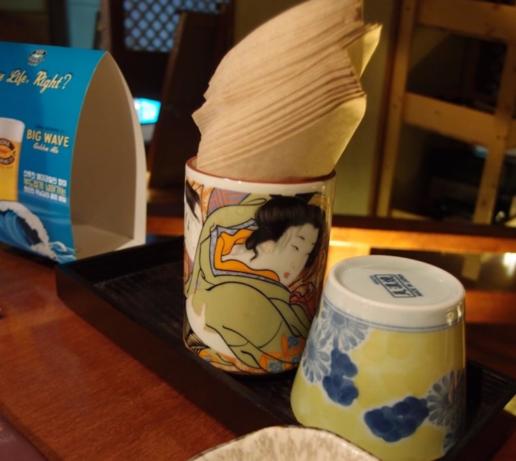 저희는 안쪽 자리에 앉았는데, 바로 옆에 매화꽃이 있어서 더 좋았어요. 아빠는 자리에 앉자마자 메뉴판부터 살펴보시더라고요.테이블에 있는 컵과 휴지케이스도 선술집 같은 느낌이죠?