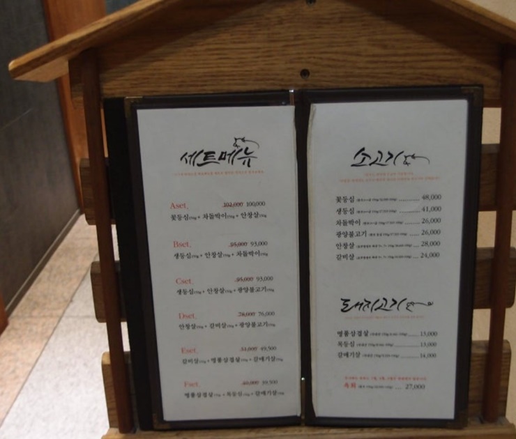 이곳은 호수공원 건너편에 있는데요. 레이크프라자1 옆 건물 효선캐슬 2층에 일산 소고기 맛집 고기가맛있는집이 있어요. 가게 앞에는 이렇게 메뉴가 있어서 기다리면서 메뉴를 살펴볼 수 있을 것 같아요.