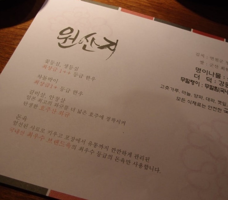 꽃등심, 생등심은 최상급 1++ 등급 한우, 차돌박이 최상급 1+ 등급한우, 갈비살, 안창살은 호주산 와규 등 반찬부터 다 최상급으로만 만드시더라고요.