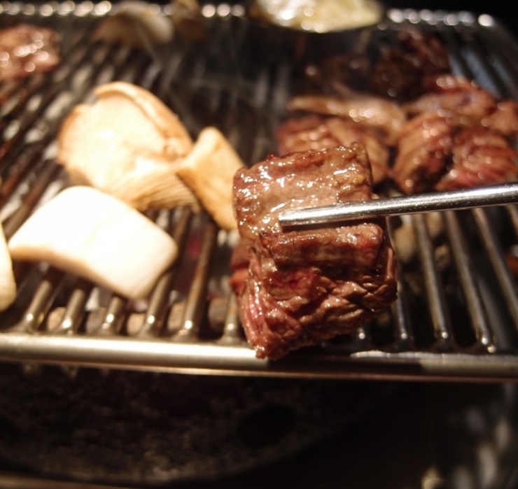 일반적인 안창살에 비해 고기 두깨감이 있더라고요. 전에 먹었던 명품삼겹살도 빛깔이 예술이었는데, 안창살 고기도 진짜 좋아보이죠? 버섯과 마늘도 구워먹을 수 있도록 함께 나왔어요. 직원분께서 먼저 고기를 올려주셨어요. 불이 쎄서 잘 구워주셔야한다고 말씀해주시고 가셨는데, 진짜 불이 쎄서 고기가 금방 익더라고요.