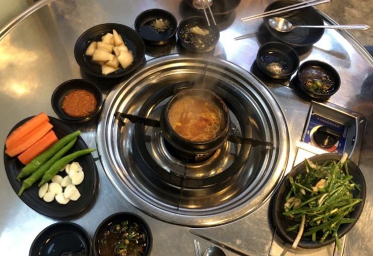 저희는 모둠곱창 2인분, 대창 1인분 섞어서 주문을 했어요. 그랬더니... 기본찬들이 주르륵 나오네요! 제일 먼저 콩나물국이 나왔어요. 매콤한 콩나물국은 곱창을 먹을 때 딱이지요!!  콩나물국에 콩나물도 듬뿍 들어있어요