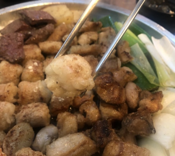 이건 대창~~ 쫄깃하고 너무 맛있어요. 하나도 질기지 않아요. 너무 질기면 이가 아픈데 하하하..  염통이에요. 염통은 오래 구워서 먹으면 질기기 때문에 살짝 익으면 바로 먹는 것이 맛있어요. 나인곱창은 불판이 돌판인데 돌판이 좋은 이유는 따뜻함이 오래 유지하고 있기 때문에 곱창을 오랫동안 따뜻하게 먹을 수 있어요. 불을 오래 켜두고 있으면 곱창이 타지만 돌판이라 불을 좀 켰다가 불판 온도가 많이 올라가면 꺼두면 곱창이 타지 않고 따뜻하게 먹을 수 있어 날씨가 쌀쌀할 때는 더더욱 좋죠!
