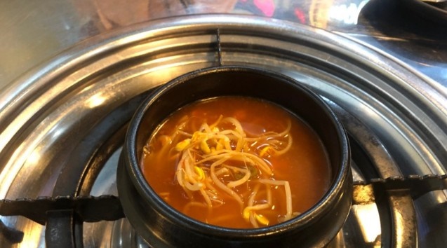 저희는 모둠곱창 2인분, 대창 1인분 섞어서 주문을 했어요. 그랬더니... 기본찬들이 주르륵 나오네요! 제일 먼저 콩나물국이 나왔어요. 매콤한 콩나물국은 곱창을 먹을 때 딱이지요!! 콩나물국에 콩나물도 듬뿍 들어있어요