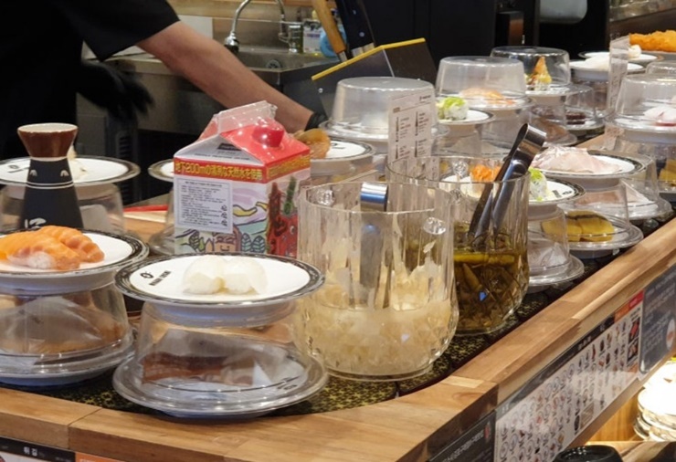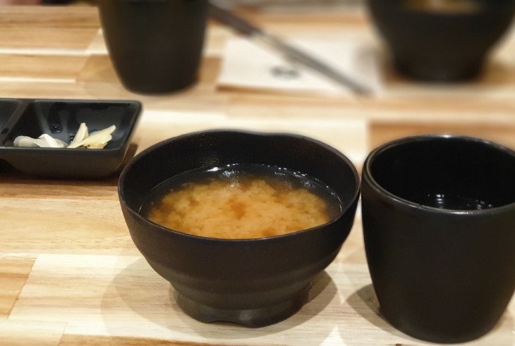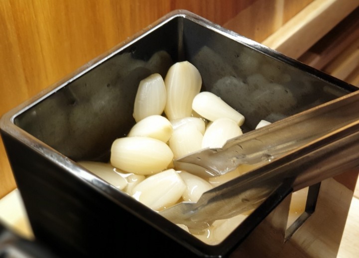 자리에 앉으면 컵과 휴지, 랏쿄, 겨자, 간장 등이 놓여 있고, 미소된장은 가져다주시고, 또 필요하면 직원분께 말씀드리면 더 가져다주세요. 초생강과 작은 고추;;; 는 회전초밥 위에 초밥과 함께 돌아다녀요. 거기서 가져다 드시면 돼요.