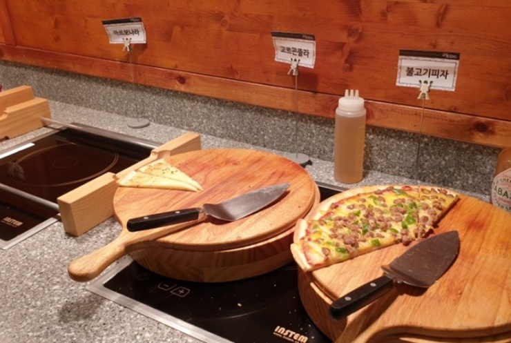 한쪽에는 아이들이 좋아하는 메뉴들이 모여있는데요. 이쪽에는 피자, 스파게티, 탕수육, 튀김들이 있어요. 파스타는 로제파스타, 봉골레파스타, 까르보나라가 있고, 피자는 고르곤졸라피자와 오코노미피자가 있어요. 사람들이 은근 닭껍질 튀김을 많이 가지고 가더라고요.