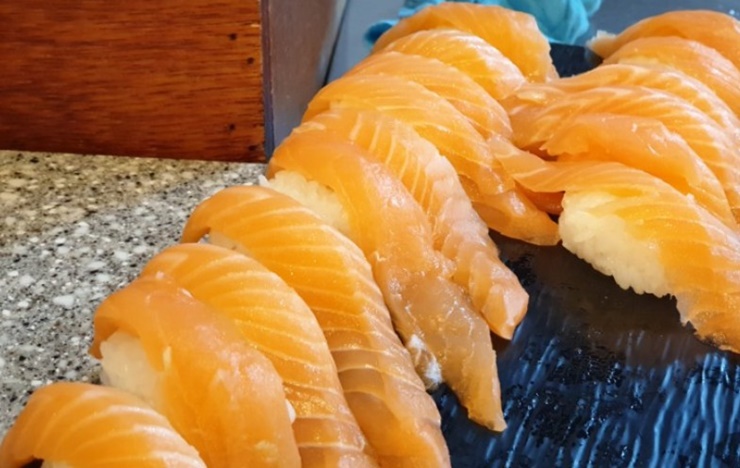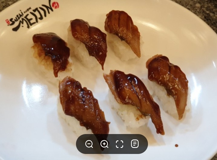 탄현 초밥 무한리필 집에는 이렇게 긴 꼬리 초밥도 만날 수 있어요. 연어가 무척 촉촉해 보이죠?
