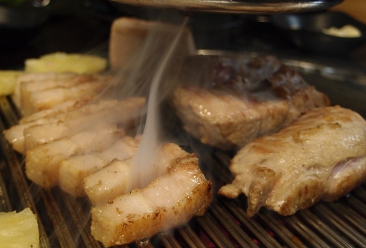 파인애플이 구우면 더 달달해서 서연이는 그렇게 좋아하더라고요. 전에는 명이나물 따로 고추냉이를 따로 먹어보 았는데, 이렇게 같이 먹는 것은 처음이었거든요.