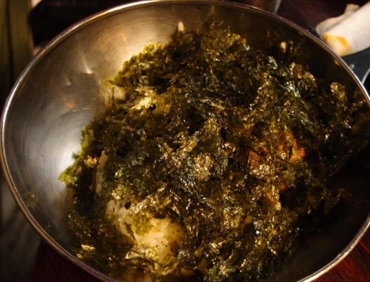 묵은지, 명이나물과 고추냉이, 무말랭이조림이 나왔는데, 다 고기와 함께 곁들여먹기 좋은 기본찬들로 구성이 되어 있었어요. 이건 처음 보는 것이었어요. 하나는 양배추를 가늘게 채를 썰음 양배추겉절이인데, 위에 계란노른자가 하나 올려져 있어요. 잘 비벼서 멸치 튀김과 함께 먹으면 된다고 하더라고요. 그래서 이렇게 먹어보았지요. 생멸치를 튀김은 처음 먹어보았어요. 멸치라서 많이 비릴 줄 알았는데, 많이 비리지 않고, 매콤한 양배추가 비린맛을 잡아주기도 하니 둘은 찰떡궁합이네요.