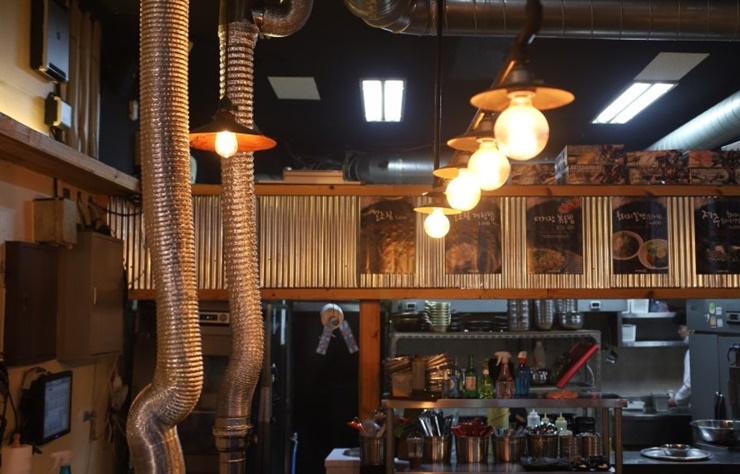 라페스타 맛집은 간판부터 깔끔해요. 저는 주차장을 찾으러 가면서 제주도그릴을 먼저 보았는데, 나무간판에 포인트로 글씨로 쓰여있는 것이 한눈에 띠었어요. 한쪽에는 숯을 하는 공간이 따로 있고, 한쪽 벽면이 통창으로 되어 있어서 여름이나 날씨 좋을 때는 문을 열고 있을 수도 있고, 밖에서도 고기를 먹을 수 있어서 더 좋을 것 같아요.