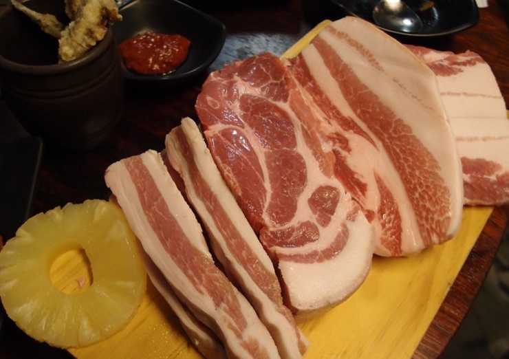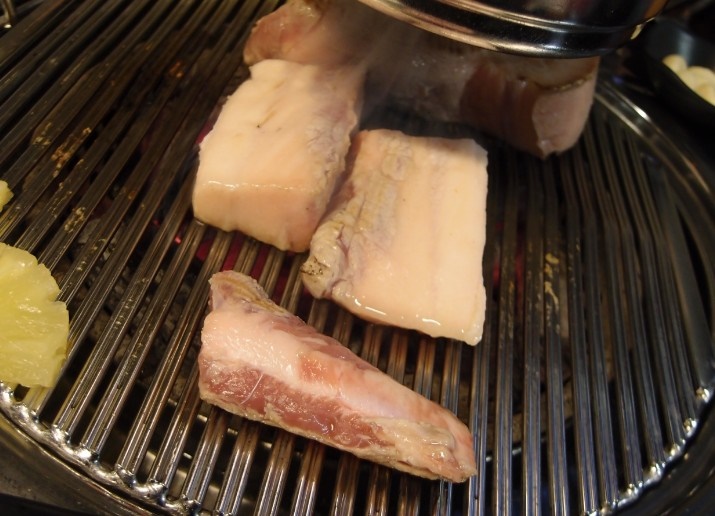 일산 흑돼지 맛집은 이렇게 파인애플이 나와요. 서연이는 구워 먹는 파인애플을 좋아하는데 조금만 타도 맛이 없다고 안 먹거든요. 처음에 나온 파인애플을 다 먹었는데 또 먹고 싶다는 서연이 이야기를 듣고 직원분께서 2개나 더 올려서 구워주셨는데 파인애플 3개를 서연이가 다 먹었어요.