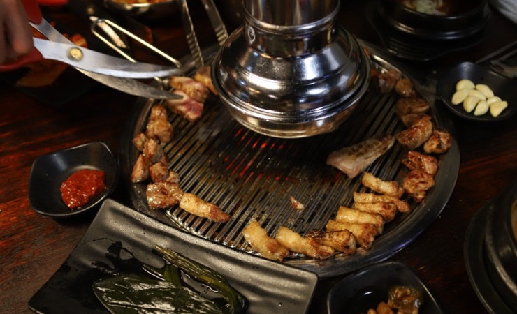 이런 직원분 모습에 제주도그릴이 라페스타 맛집이 된 것 같기도 해요. 맛집이 맛은 당연한 것이지만 친절함도 한몫하거든요. 옆에서 고기를 살펴보시면서 정성스럽게 잘라주셨어요. 고기가 타지 않게 가장자리에 올려주시는  센스!!