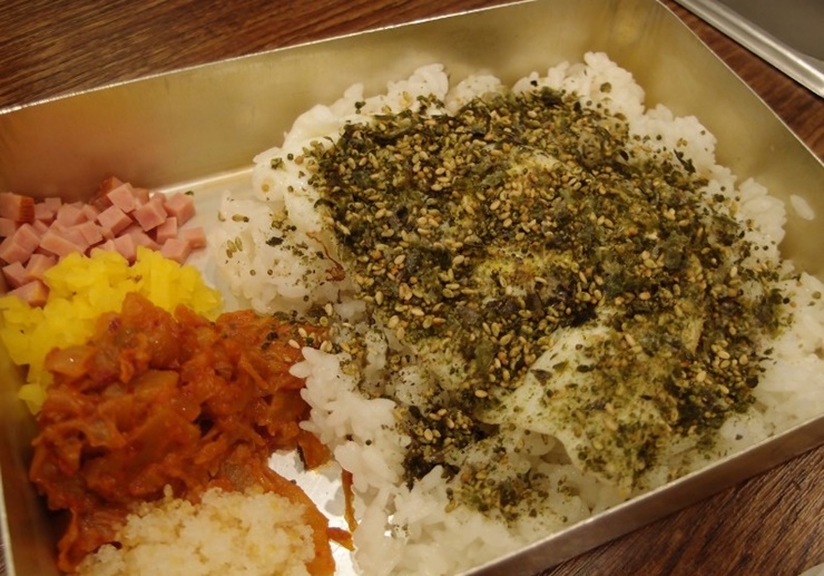 구래동 밥집에서 아이들은 공깃밥을 시켜주고, 저는 추억의 도시락을 하나 주문을 했지요. 아이들이 추억의 도시락이 어떤 게 들어있는지 궁금하다고 해서 안에는 열어주었더니 이렇게 햄, 단무지, 김치, 계란프라이 등이 들어있더라고요.