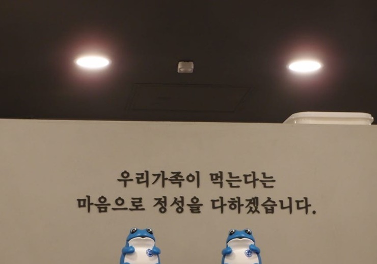 가게 인테리어나 내부는 깔끔했어요. 조명들이 환하게 있어서 더 깨끗하고 깔끔한 느낌이 물씬 풍겼답니다. 주방 위쪽에 "우리 가족이 먹는다는 마음으로 정성을 다하겠습니다"라는 글귀가 있었는데 그 글귀가 참 마음에 와닿았어요.