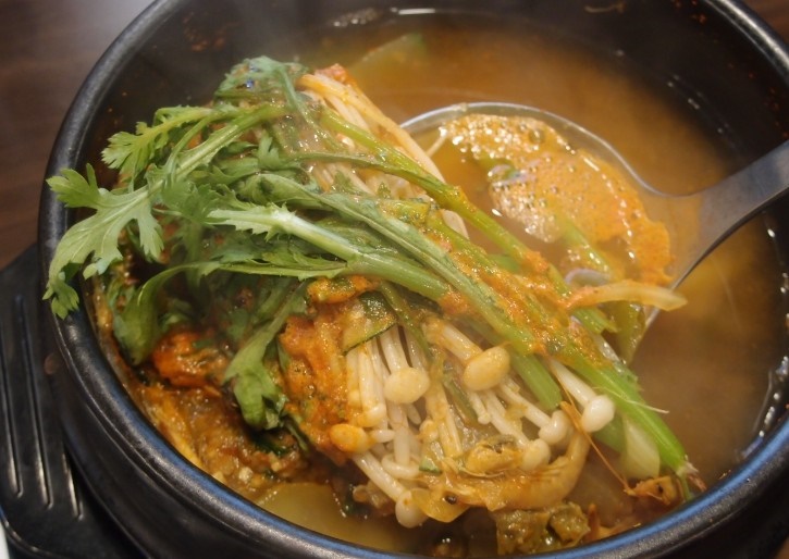 통으로 구운 버섯도 쌈장에 찍어서 먹고, 아스파라거스는 그냥 먹어도 맛있어요. 감자도 얇게 썰어져 나와서 감자튀김 같은 맛이 나더라고요. 개인적으로 고구마는 좋아하지만 감자는 별로인데 두 개를 뚝딱 다 먹었어요. 고기를 주문하면 같이 나오는 해물 매운탕이에요. 보글보글 끓여져 나오는데, 아주 매콤해요. 버섯과 미나리도 듬뿍 들어 있어요. 꽃게가 들어있으니 국물은 역시나 맛있겠지요~