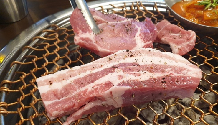 이 고기의 빛깔 보세요. 그리고, 비계와 살코기의 조화로움 비계가 너무 많으면 느끼하고, 살코기가 많으면 퍽퍽하고 이렇게 조화로운 고기~ 사랑입니다. 직원분께서 손수 고기를 올려서 구워주셨어요 저는 고기를 구워주는 게 좋더라고요 이렇게 고기가 두꺼우면 다 익었는지 안 익었는지 헷갈릴 때도 있고 딸을 챙기다 보면 고기가 타기도 하고 정신없을 때도 많거든요