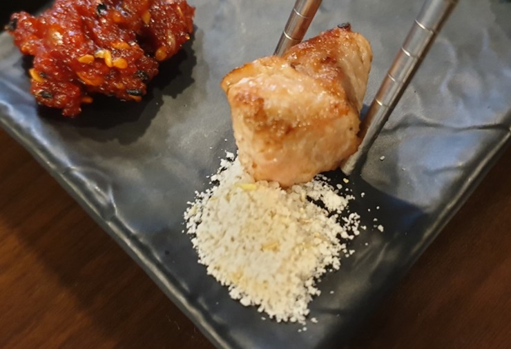 첫 번째는 와사비만 삼겹살 위에 올려서 먹어보고, 두 번째, 세 번째는 소금으로 찍어서 먹었어요. 소금이 두 종류였는데, 뭐가 다른지 물어보고 싶었는데, 너무 바쁘신 것 같아서 못 물어보았어요 하나는 고운 소금이었고, 하나는 함초소금같이 보였는데 맞는지는 모르겠어요.