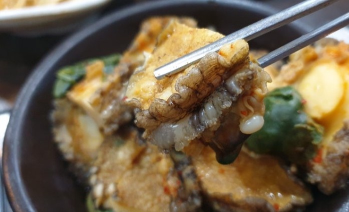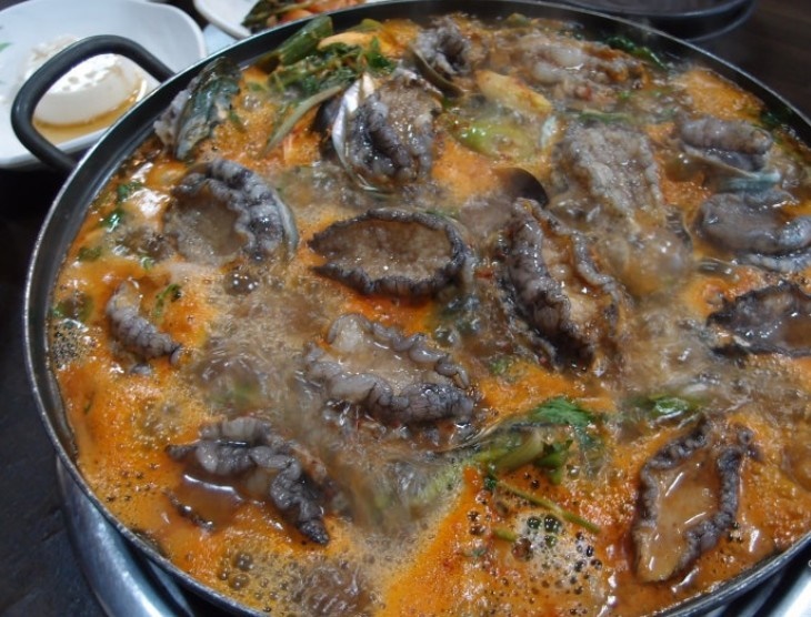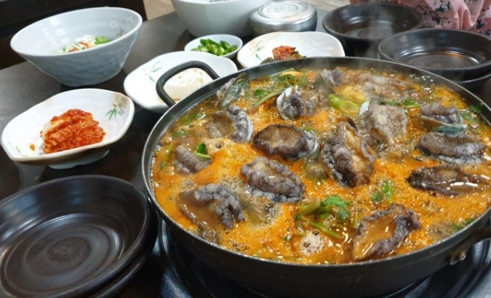 소화 흡수가 잘 되어서 전복죽으로 많이 드시는 것 같아요. 아이들과 전복에 대해 이야기를 하고 있으니 전복해물탕이 보글보글 끓기 시작하네요. 산방산식당 사장님께서 등장하셨어요. 오셔서 전복을 다 꺼내주셨는데요. 살아있는 전복이라 내장까지 다 먹어도 된다고 이야기하시면서 전복을 보여주셨는데 암컷과 수컷이 있다고 하시면서 보여주시더라고요. 암컷, 수컷 처음 알았네요. 전복이 암컷 수컷에 대한 생각은 해본 적이 없거든요;;