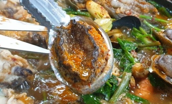 기본 찬도 다 나왔고, 저는 간장에 겨자를 올려놓고 샐러드를 먹으면서 전복 해물전골이 나오기만을 기다리고 있었지요. 등장한 전복해물전골이에요. 우와~~ 태어나서 이렇게 많은 전복을 보는 건 처음이에요. 같이 간 선생님도 깜짝 놀라더라고요. 이렇게 많은 건 처음 본다면서... 저도 공감입니다.